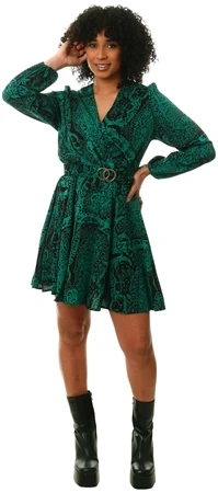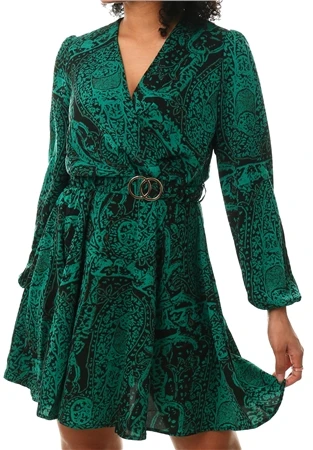 - Green Printed Wrap Over Belted Long Sleeve Skater Dress