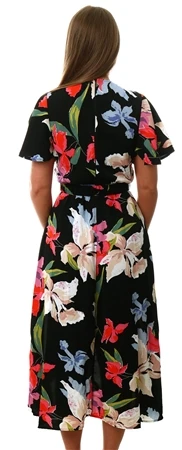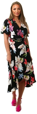 - Stay sophisticated in this Multi Floral Printed Short Sleeve Belted Wrap Midi Dress. Featuring short butterfly sleeves, this wrap over style dress has a gold buckle belt and a zip up back. Simply pair with gold heels and accessories to complete the look.