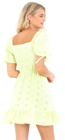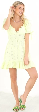 Brave Soul Lime Green Broderie Anglaise V Neck Frilly Mini Dress