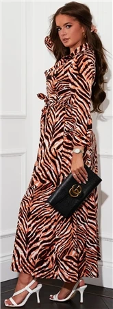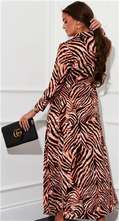 Girl In Mind Orange Tiger Print Brielle Long Sleeve Shirt Maxi Dress