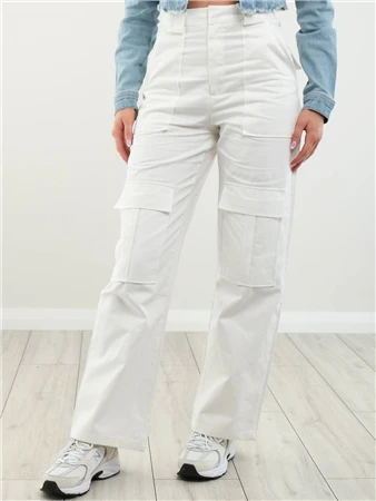 - Get the ultra cool and casual look babe with our Amaia White High Waisted Cargo Trousers, featuring a high waisted look with pocket detail in an oversized fit. Perfect styled with a crop top and trainers