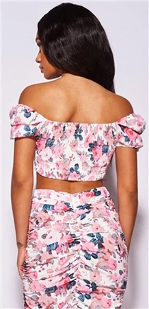Parisian White Floral Ruched Front Puff Sleeve Crop Top