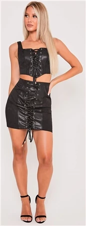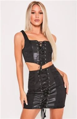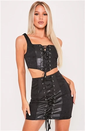 Saint Genies Black Eirian Jacquard & Faux Leather Lace Up Mini Skirt
