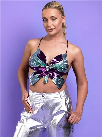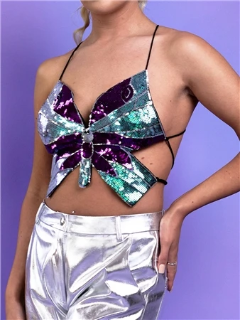 Saint Genies Black/Green Sequin Butterfly Top