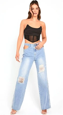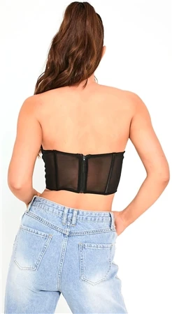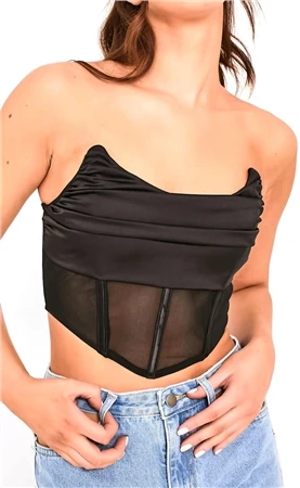 Saint Genies Black Satin Drape Front Mesh Detail Corset Top