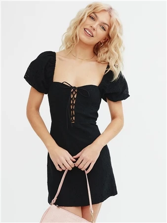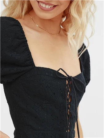 The Frolic Black Crochet Short Puff Sleeve Dress